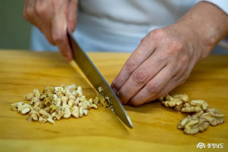 1. 따뜻한 물에 호두를 불려 껍질을 제거한 후 1cm 정도로 썰고, 일부는 잘게 다져줍니다.