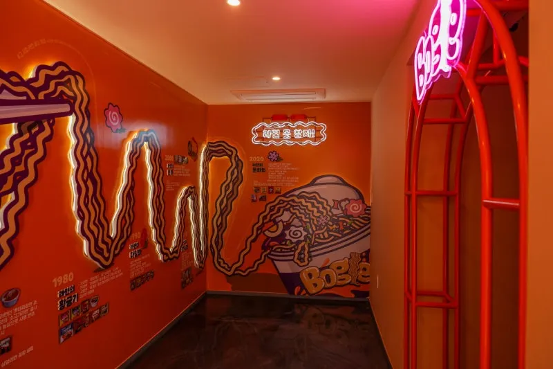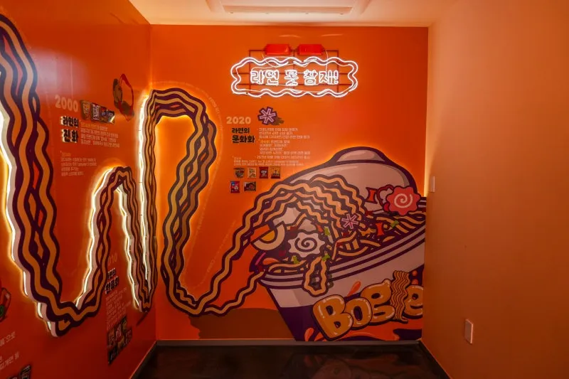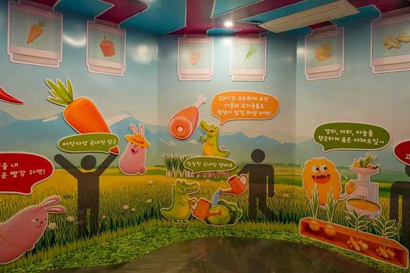 이 공간은 라면 캐릭터와 함께 꾸며진 벽면 그래픽이 귀엽고 아기자기하여