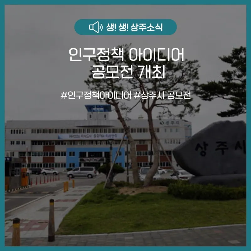 상주시는 인구감소와 지역소멸 문제 해결을 위해 시민들의 관심을 높이고, 저출생 극복과 인구 유입 확대에 기여할 수 있는 창의적인 아이디어를 발굴하고자 「상주시 인구정책 아이디어 공모전」을 개최합니다.