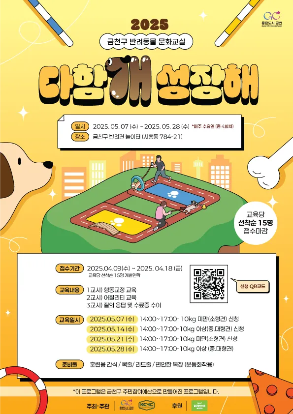 - 교육 회차당 선착순 15인 접수_개별 연락- [교육일정] -날짜 : 2025.05.07~05.28 (매주 수요일)14:00~17:00 (5/7,5/14/5/21,5/28 중 선택) -장소 : 금천구 반려견 놀이터 (시흥동 784-21) -교육내용 : 5월 7일( 소형견 -10kg 미만- ) - 1교시 -반려견 행동 교정 2교시: 어질리티 교육 3교시 : 질의 응답 및 수료증 수여 5월14일(중.대형견-10kg 이상 )- 1교시 -반려견 행동 교정 2교시: 어질리티 교육 3교시 : 질의 응답및 수료증 수여 5월 21일( 소형견 -...