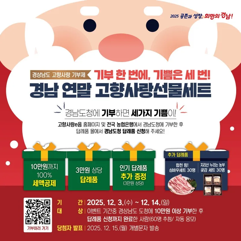 이번 행사는 ‘기부 한 번에, 기쁨은 세 번! 경남 연말 고향사랑선물세트’라는 주제로 기획됐습니다. 경남도에 10만 원 이상을 기부하면 ①세액공제(10만 원까지 전액 환급, 초과 시 16.5%), ②답례품(기부금의 30% 내) 혜택에 더해 ③추첨을 통한 인기 특산품 추가 증정 기회까지 제공해 기부자에게 파격적인 혜택을 선사합니다.