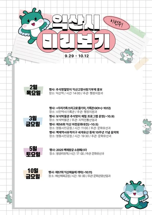 익산시 주간 주요 행사 9월 5주차 (2025. 9. 29. ~ 10. 12.)