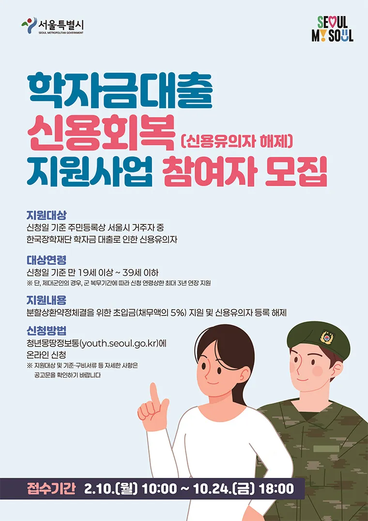학자금대출 신용회복 지원이 필요한 서울 거주 청년은 10월 24일 오후 6시까지 청년 몽땅 정보통에서 별도 서류 제출 없이 온라인으로 신청하면 된다. 다만, 40~42세 의무복무 제대군인은 병역 기간이 자동으로 확인되지 않는 경우 병적증명서 또는 주민등록초본을 별도로 제출하여야 한다. 병역 기간 자동 확인 여부는 신청 시 페이지에 표시된다. 신용유의자 등록 여부 확인은 한국장학재단 신용회복지원상담센터(1599-2250)에서 가능하다.