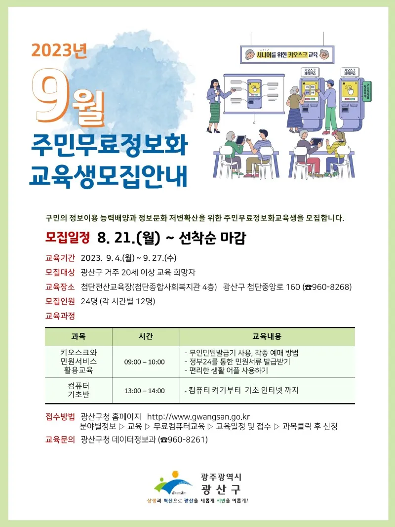 광산구청 홈페이지 > 분야별정보 > 교육 > 무료컴퓨터교육 또는 방문접수