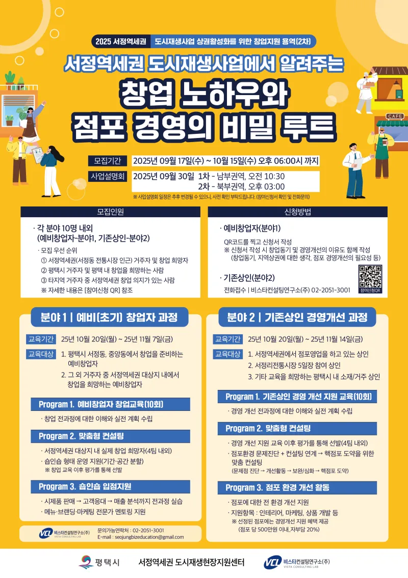 「서정역세권 도시재생사업」의 일환으로 예비창업자 및 기존상인을 대상으로 창업·경영 인큐베이팅 프로그램을 운영하고자 하오니, 관심 있는 분들의 많은 신청 바랍니다. 1. 모집기간 - 2025. 09. 17.(수) ~ 2025. 10. 15.(수) 오후 06:00시 까지 2. 모집대상 가. 예비(초기) 창업자 과정 - 평택시 서정동·중앙동에서 창업을 준비하는 자 - 서정역세권 내에서 창업을 희망하는 자 나. 기존상인 경영개선 과정 - 서정역세권 내 점포 운영 상인 - 서정리전통시장 5일장 참여 상인 - 기타 평택시 내 상인 3. 교육 ...
