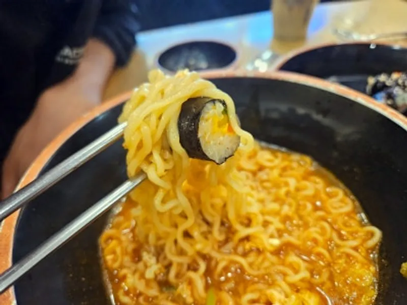 치즈김밥을 라면에 돌돌 말아 먹으니