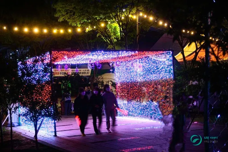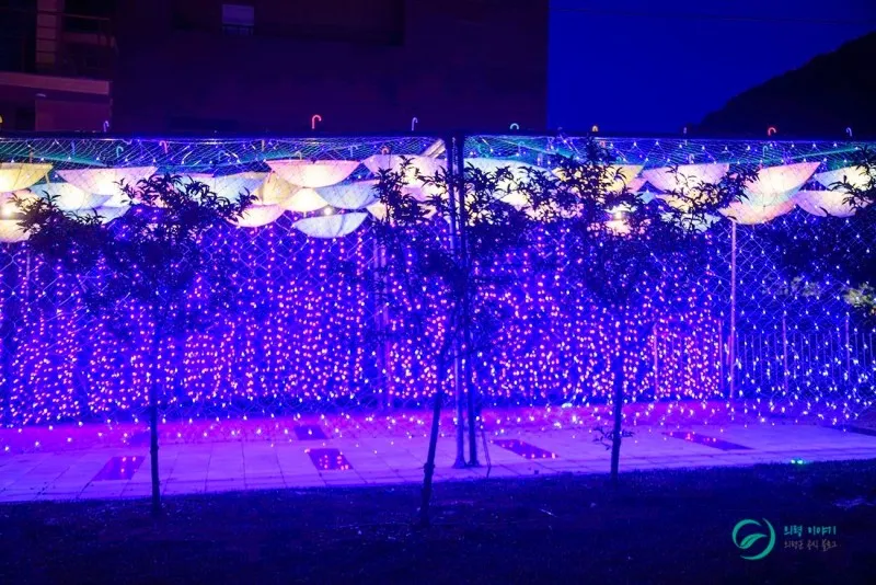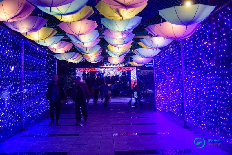 작은 불빛을 양쪽에 설치한 통로 만들었으며 위쪽에는 우산을 거꾸로 매달아 놓아 모두가 의미를 담고 있는 것인지? 상상력을 동원하게 하였습니다.