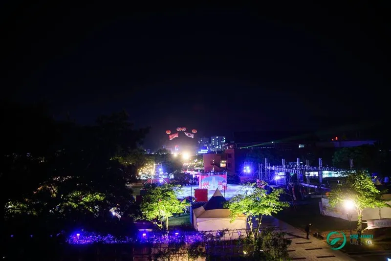 의령 홍의장군 축제장을 의령 천 흔들다리 위에서 바라본 야경입니다. 의령의 서동공원은 조성한 시기가 오래되지 않았으나 조경 숲이 좋아 숲속에 빛이 번졌냐고 있습니다. 멀리 애드벌룬이 떠 있는 곳이 축제 주 무대가 있는 곳입니다. 왼쪽 하늘에는 드론이 높이 떠서 점멸하고 있습니다.