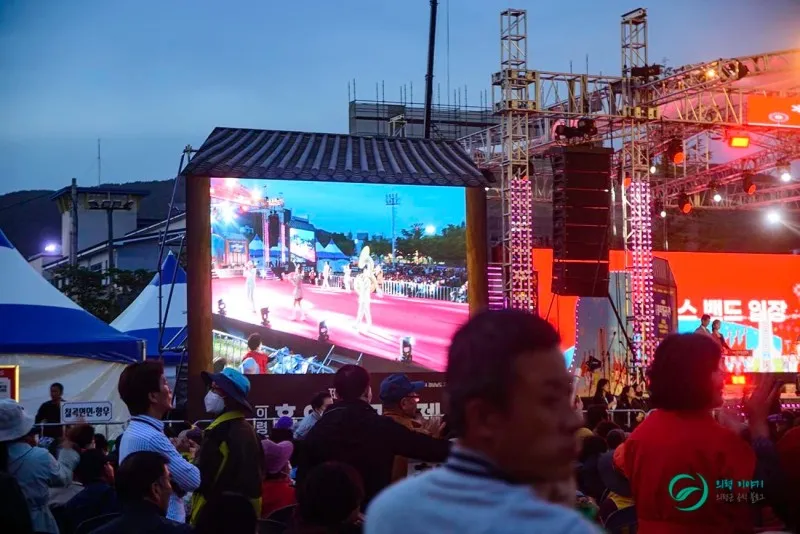 축제 개막식을 개최하기 위하여 준비하고 있는 식장으로 입장하여 보았습니다. 대형화면에 영상이 소개되고 지금 퍼포먼스를 할 대형이 개회식장으로 입장하려고 농악대의 풍물 소리가 크게 들립니다.