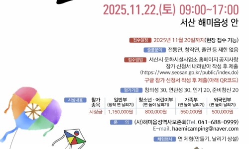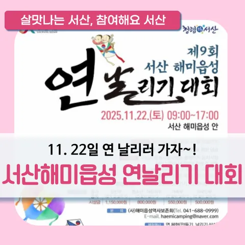 2025 년 제 9 회 서산해미읍성 연날리기 대회가 2025.11.22.( 토 ) 에 개최됩니다 . 관심있는 분들의 많은 참여 부탁드립니다 . ○ 일 시 : 2025. 11. 22.( 토 ) 09:00 ~ 17:00 / 개막식 14 시 ○ 장 소 : 서산해미읍성 내 ○ 주요내용 : 참가자 연 퍼레이드 , 식전 공연 , 창작 연날리기 , 연 높이 날리기 , 체험 프로그램 ( 연만들기 등 ) ○ 접수방법 : 전화 / 이메일 접수 ※ 당일 현장접수 가능 ○ 접 수 ...