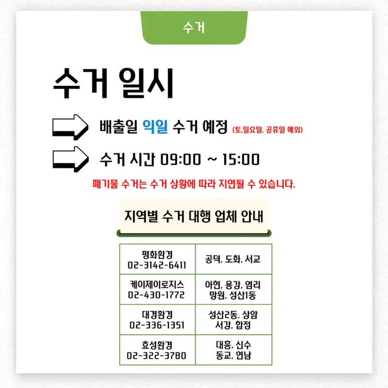 수거는 토요일, 일요일, 공휴일을 제외하고