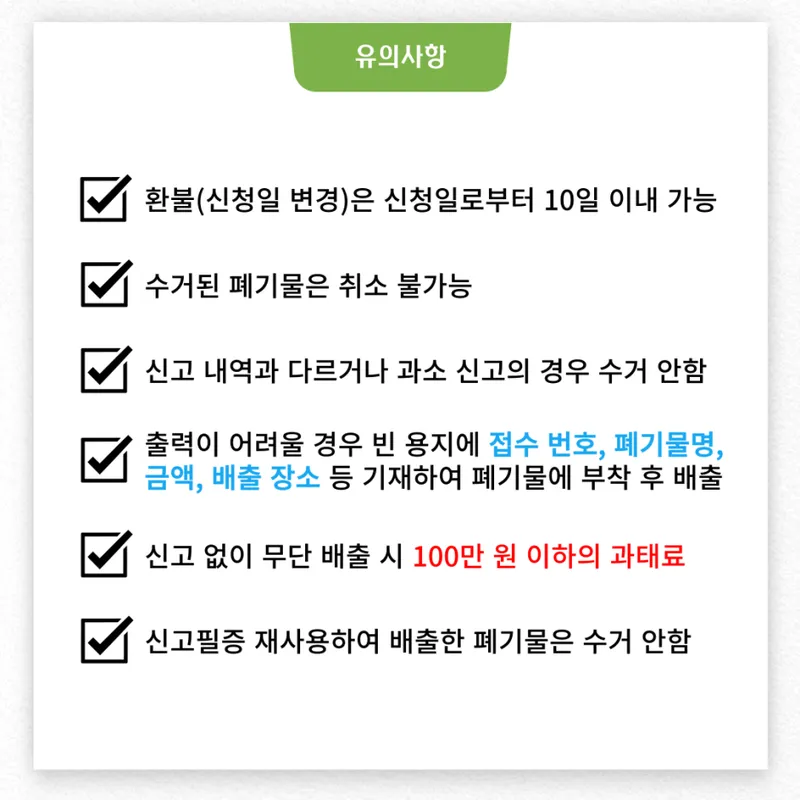 접수 번호, 폐기물명, 금액, 배출 장소 등을