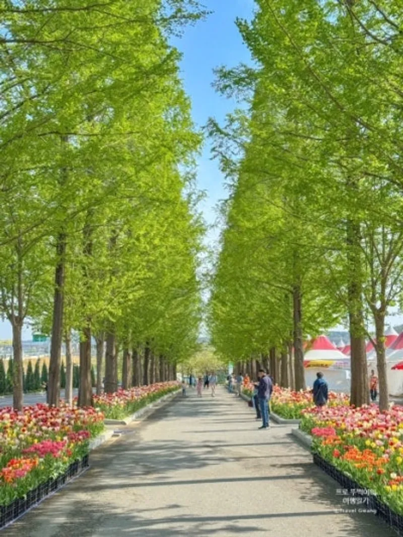 메타세콰이어길 양옆으로 펼쳐진 튤립밭(좌),