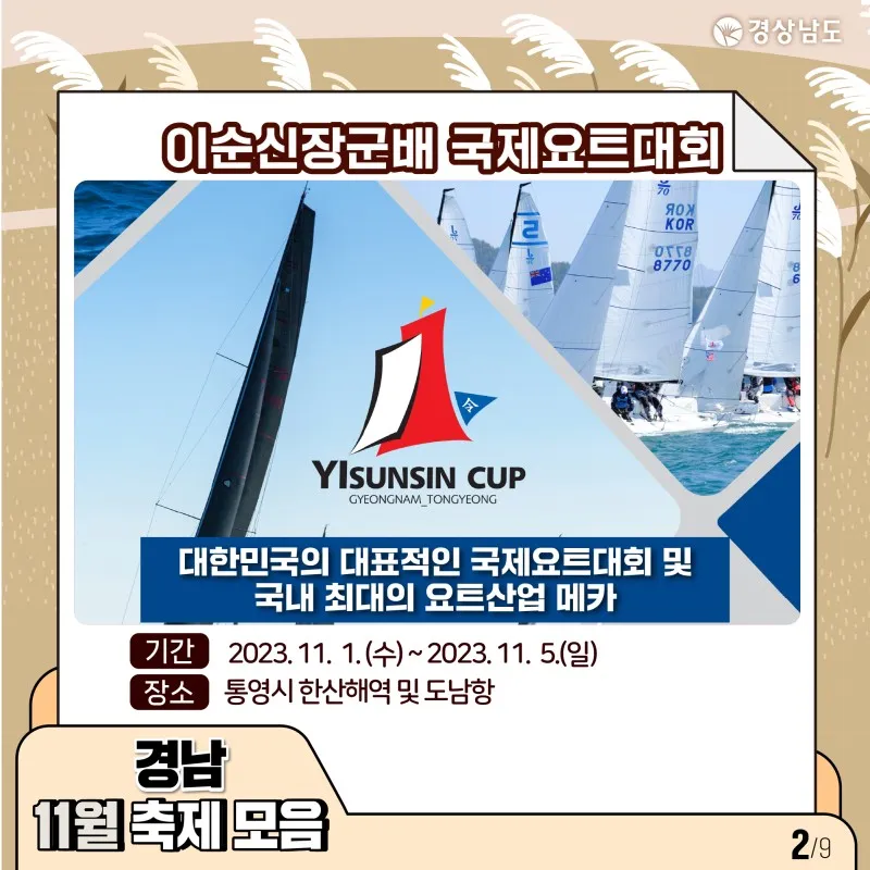 📅 일자 : 2023.11.1.(수)~11.5.(일) 📍 장소 : 통영시 한산해역 및 도남항 ⌨ 홈페이지 : http://www.yiyr.org/kr/main.php |
