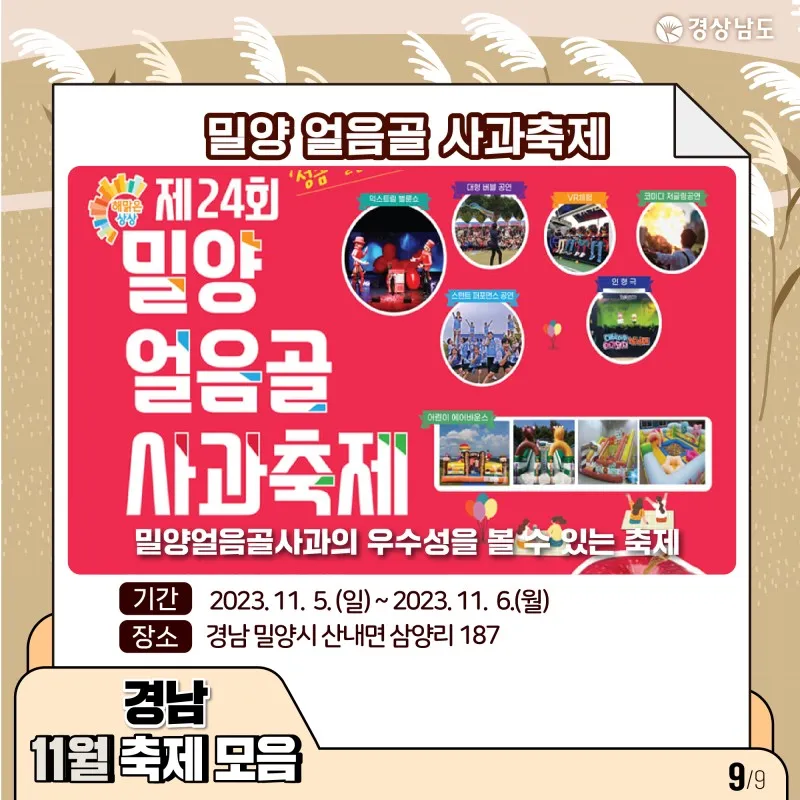 📅 일자 : 2023.11.4. (토)~11.5.(일) 📍 장소 : 밀양시 밀양대공원로 86 |