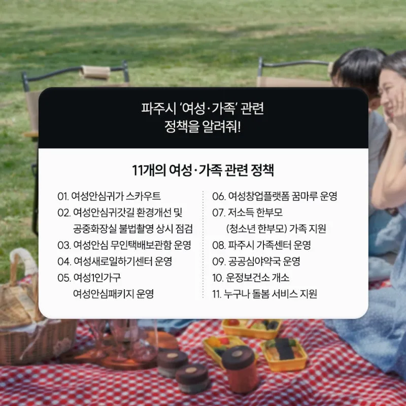 파주시에는 총 11개의 여성·가족을 위한 정책이 마련되어 있습니다.