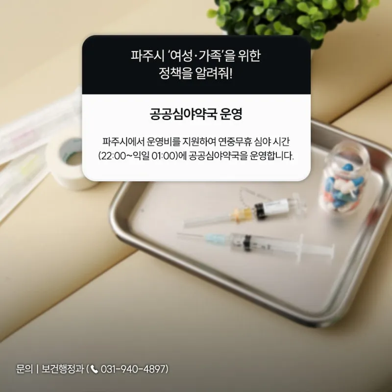 심야 시간(22:00~익일01:00)에 파주시에서 운영비를 지원하여 공공심야약국을 운영합니다.