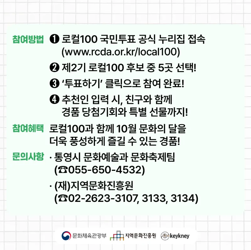 제2기 로컬100 투표하기 투표확인 투표기간 10.1.(수) ~ 10.31.(금) 참여자격 국민 누구나! 투표하기 국민과 함께 만들어가는 진짜 매력, 대한민국 “로컬100”을 투표해주세요. 로컬100은 지역문화에 기반을 둔 특색있는 문화자원을 발굴·확산하는 사업입니다. 우리 지역과 동네를 대표할 수 있는 매력적인 문화자원에 대해 생각해 보는 것은, 지역의 가치를 발견하는 첫걸음입니다. 가족이나 연인, 친척 등 소중한 사람들과 함께 즐기고 싶은 문화자원도 떠올려 보세요. 다른 지역에 살고 있는 주민에게 우리 동네의 특별한 매력을...