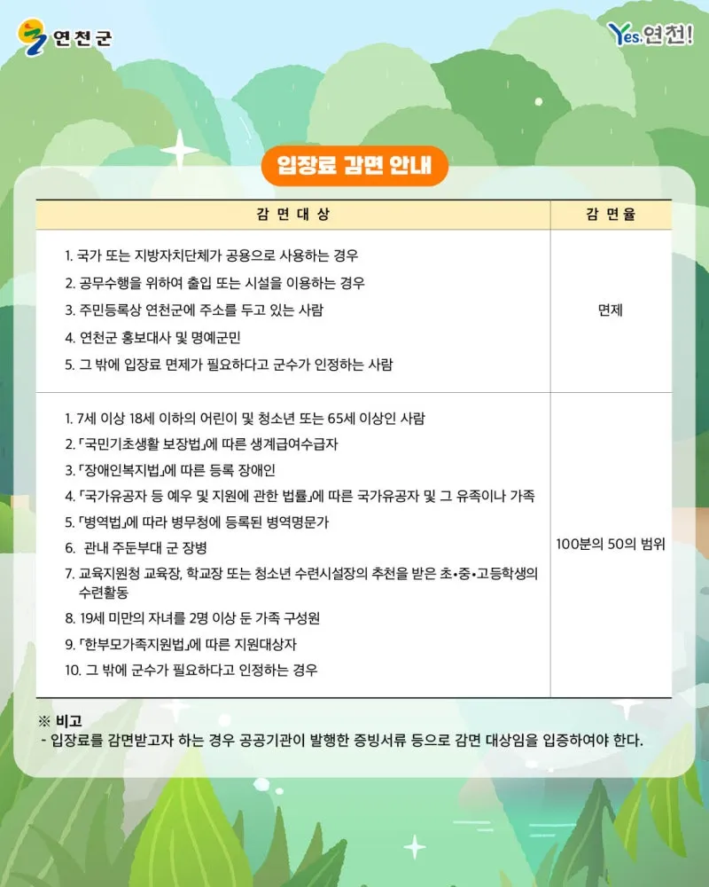 무료입장: 연천군민, 홍보대사·명예군민, 6세 이하 영유아, 공무수행자 등
