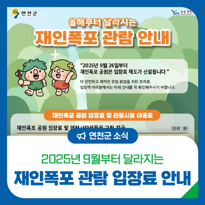 “2025년 9월 26일부터 재인폭포 공원은 입장료 제도가 신설됩니다!”