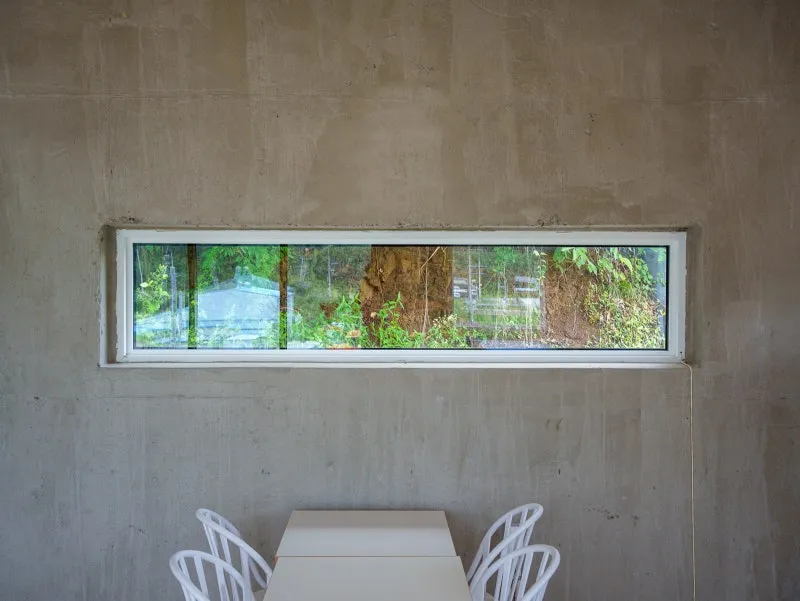 노출 콘크리트 벽과 여름의 초록색 풍경이 잘 어우러졌습니다.
