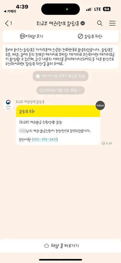 여권발급신청이 접수되면 알림톡으로