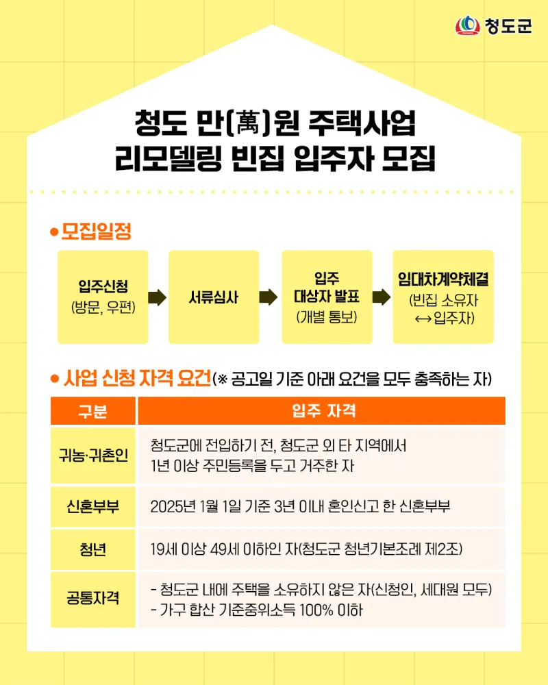 귀농귀촌 신혼부부 청년 지원, 청도 만원 주택사업 빈집 리모델링 입주자 모집