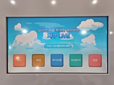 이곳은 지구와 환경 코너인데요, 실시간 지구환경을 알아볼 수 있는 지구 라이브, 아이들이 원하는 버튼을 눌러 지구 모형에 나타나는 다양한 변화를 학습할 수 있도록 되어 있습니다.