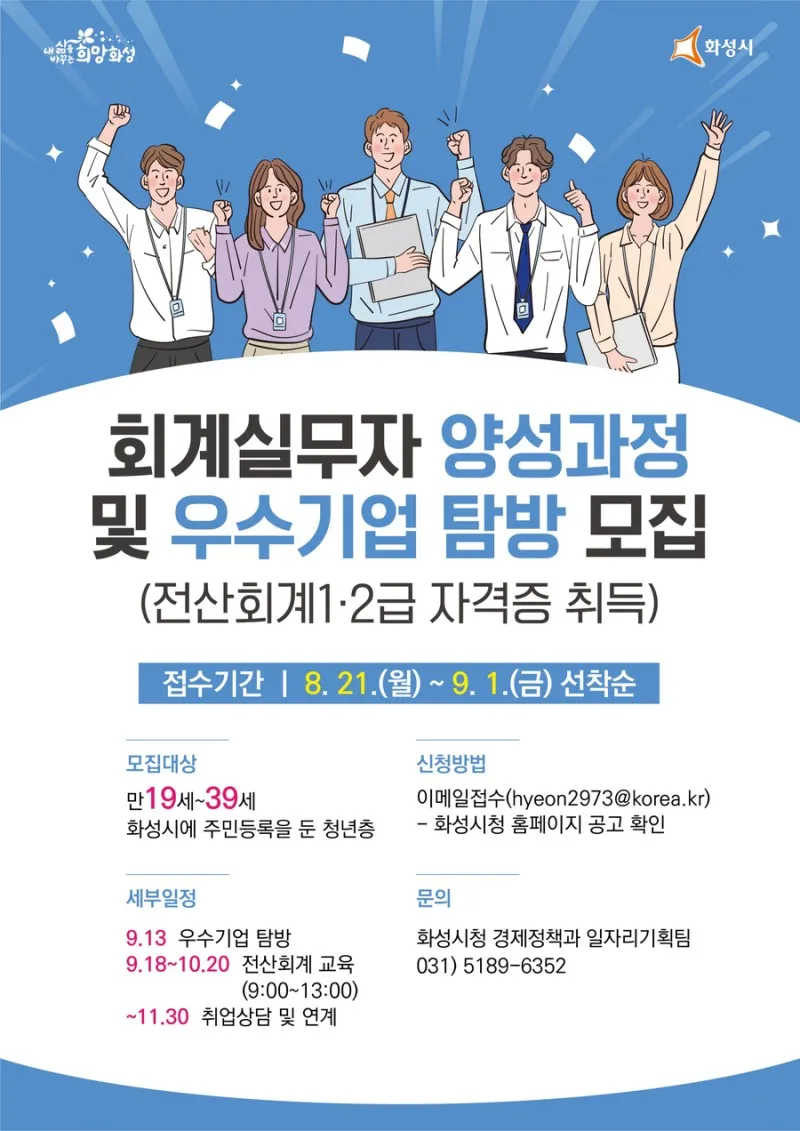 화성시에서는 2023년 8월 21일부터 회계실무자 양성을 위한 교육과 함께 우수기업 탐방 참여자를 모집하고 있습니다. 우수기업 탐방과 전산회계 1·2급 자격증도 취득하고 취업상담 및 연계까지 받을 수 있는 기회를 놓치지 마세요!