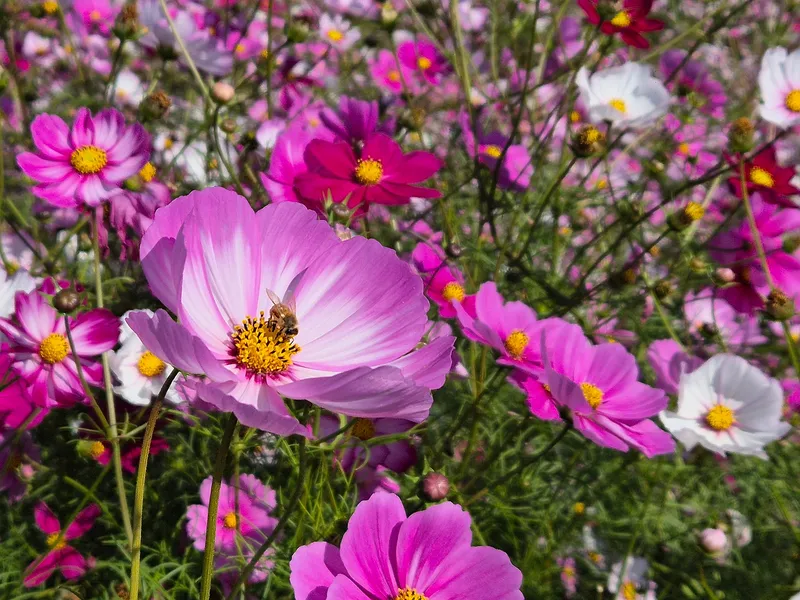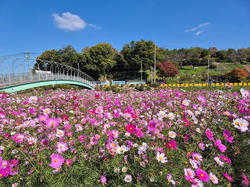 바람이 불면 코스모스들이 흔들리는데 마치 한 폭의 그림과도 같습니다. 그 모습을 보고 있으면 자연스럽게 마음이 편안해집을 느낍니다. 가을의 청량한 하늘과 어우러져서 더욱 환상적인 풍경을 자아냅니다.
