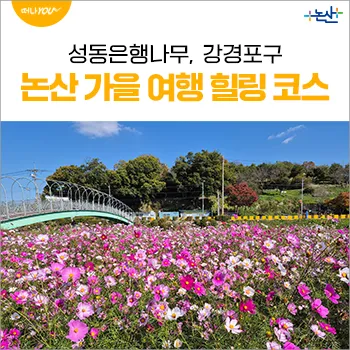 논산 가을 여행에서 가을 정취를 만끽할 수 있는 힐링 코스를 소개합니다. 가을이 되면 황금빛으로 물드는 성동 은행나무와 매년 코스모스가 만발하는 강경포구를 돌아보고 왔습니다. 이 두 장소를 여유롭게 거닐면서 가을의 정취를 가득 느낄 수 있었습니다. 논산 가을 여행 계획 중이신 분들에게 가족과 친구, 연인과 힐링 코스로 추천드립니다.