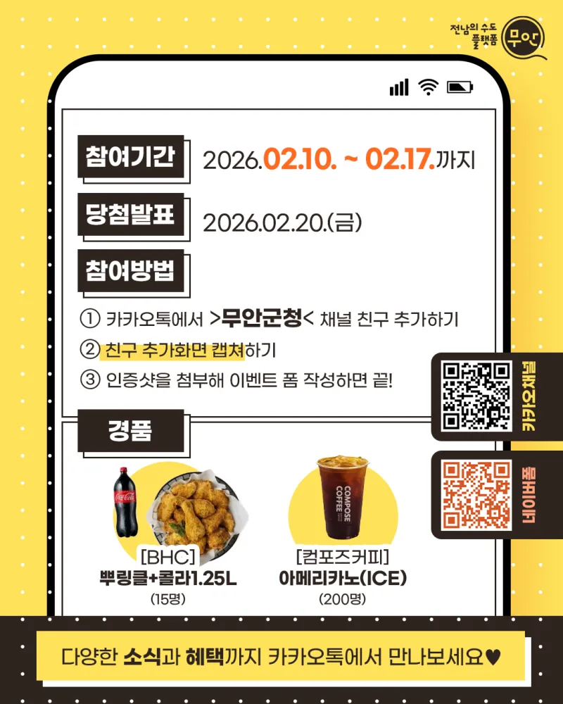 #무안군 #무안군청 #카카오톡채널 #카카오톡친구추가 #이벤트 #이벤트참여 #오픈이벤트 #설날이벤트 #설연휴 #이벤트경품 #치킨이벤트 #커피이벤트 #SNS이벤트 #군정소식 #팔로우이벤트