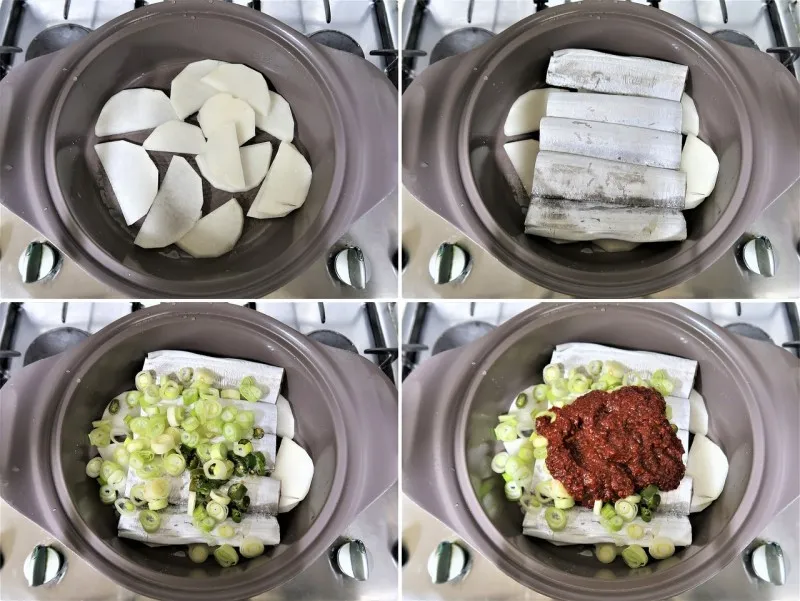 냄비에 먼저 무를 깔아주세요.