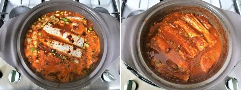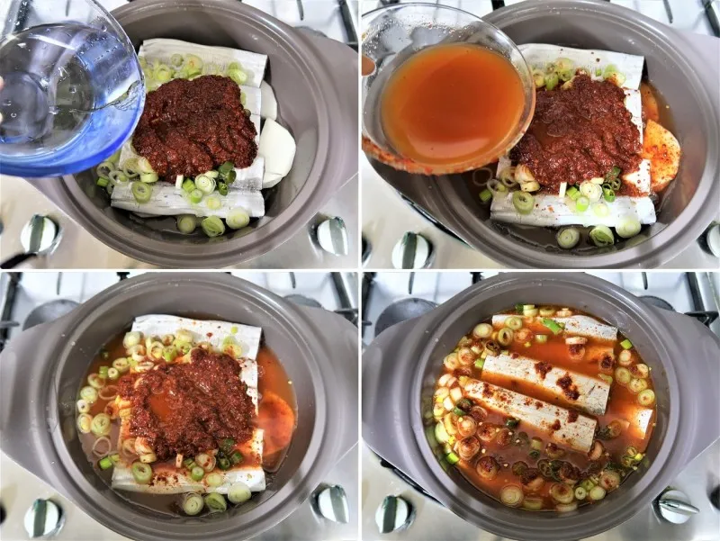 무를 먼저 깔아야 냄비에 눌어붙지 않습니다.