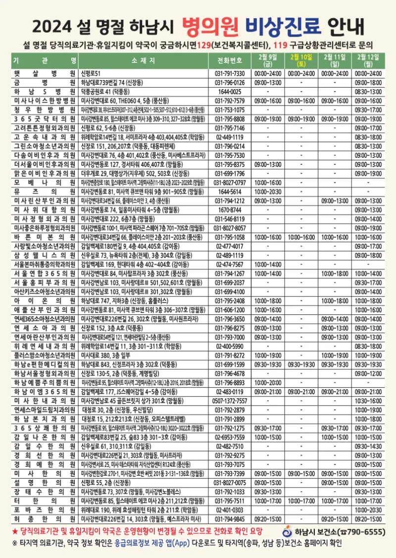 2024년도 하남시 설 명절 당직의료기관 안내