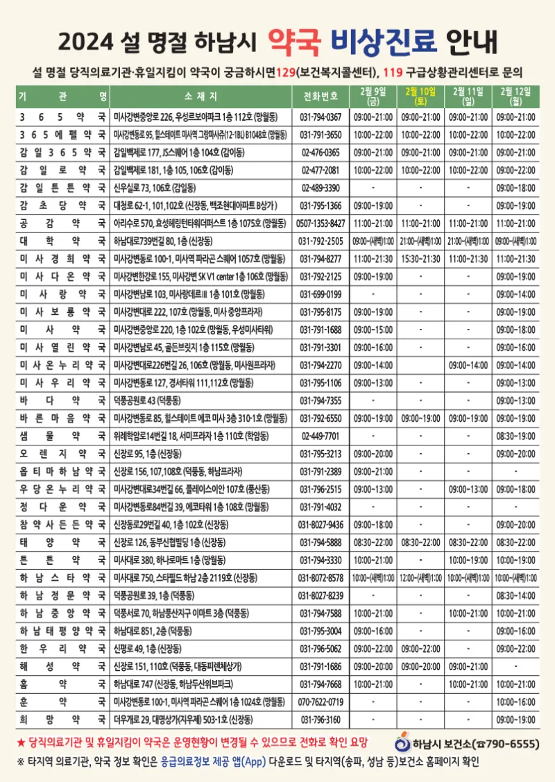 2024년도 하남시 설 명절 휴일지킴이약국 안내