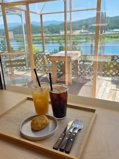 바깥으로 예쁜 풍경이 보여 힐링하기 딱인 양구 카페예요.