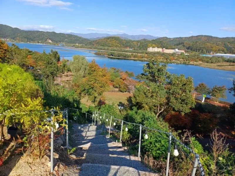 한쪽에는 파로호가 보여 윤슬이 반짝이는 풍경이 펼쳐지고,