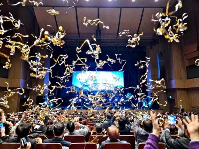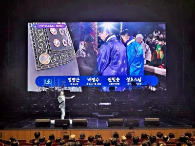 그리고 마지막 2025년을 안녕하고 2026년을 맞이하는 카운트다운이 시작됩니다. 용주사에서 진행된 송년 제야행사가 이원으로 생중계 송출됩니다. 5, 4, 3, 2, 1 카운트다운에 이어 시작된 2026년을 1540객석 모든 사람들과 함께 축하합니다. 이어 태평성대를 기원하는 11팀 33번의 타종까지 함께합니다.