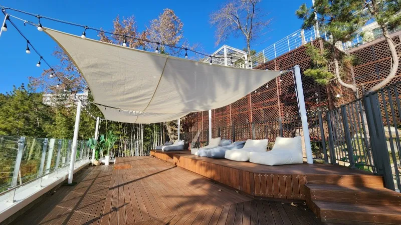 햇빛 차단용 가림막도 있고 폭신한 의자도 있어서 전망 좋은 카페 부럽지 않습니다.