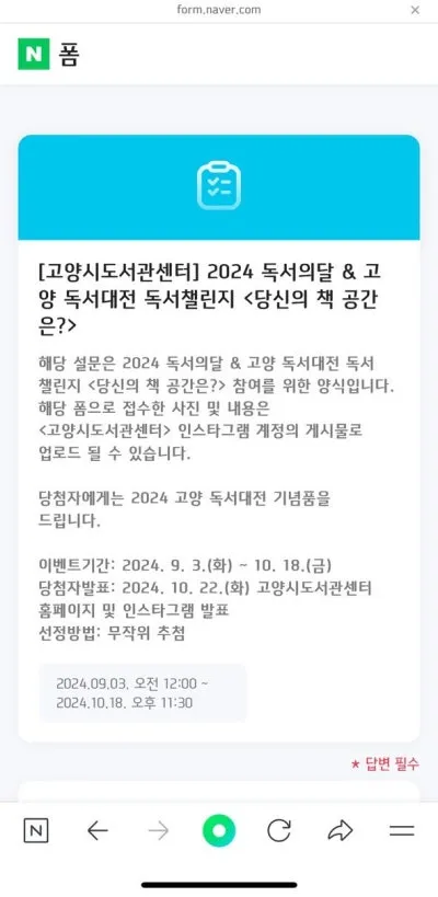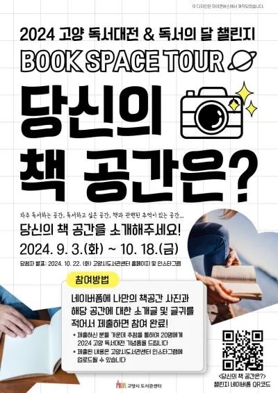 챌린지는 2종 모두 10월 18일까지 진행되는데요. 챌린지에 응모한 내용은 고양시도서관센터 인스타그램 계정의 게시물로 업로드될 수 있으며, 무작위 추첨을 통해 2024 고양 독서대전 기념품을 제공한다고 해요.