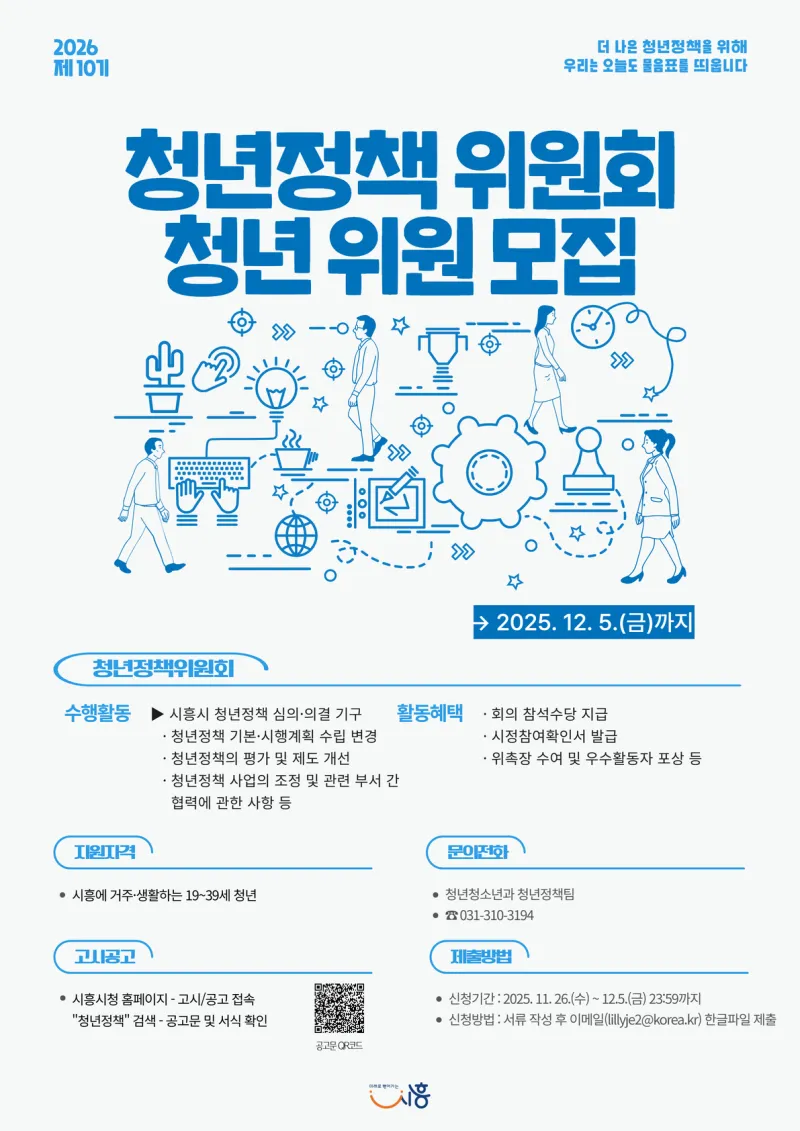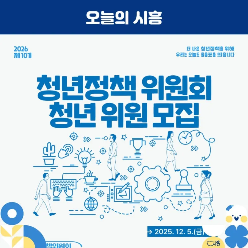 시흥시는 청년들의 다양한 목소리를 들을 수 있는 제10기 시흥시 청년정책위원회 청년위원을 오는 12월 5일까지 공개 모집합니다.