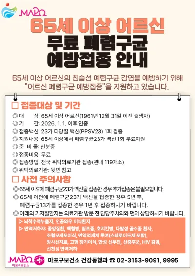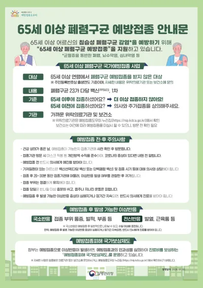65세 이상 어르신을 위한 🩺폐렴구균 예방접종💉 지원