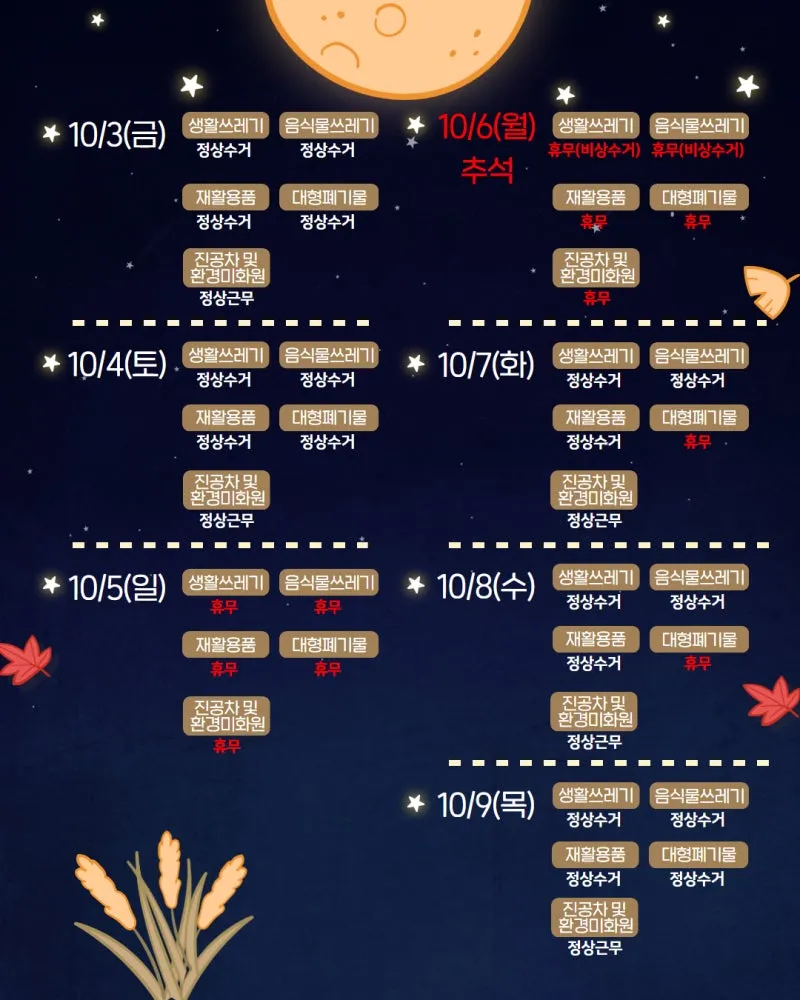 | <날짜별 수거 일정 요약> 10. 3.(금) ~ 10. 4.(토): 모든 쓰레기 정상 수거 10. 5.(일): 모든 쓰레기 미수거 10. 6.(월) 추석 당일: 모든 쓰레기 미수거 (비상 수거만 운영) 10. 7.(화) ~ 10. 8.(수): 대형폐기물 제외, 정상 수거 10. 9.(목): 모든 쓰레기 정상 수거 |