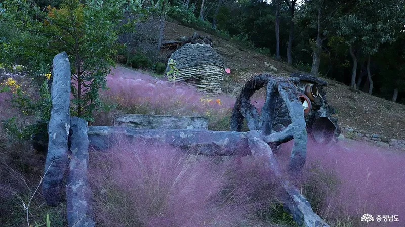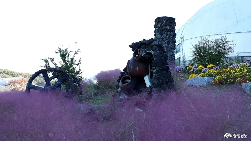 핑크뮬리 속의 수레바퀴 조형물이 특이한 분위기를 조성하고 있네요.