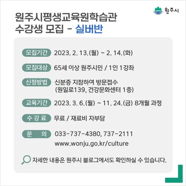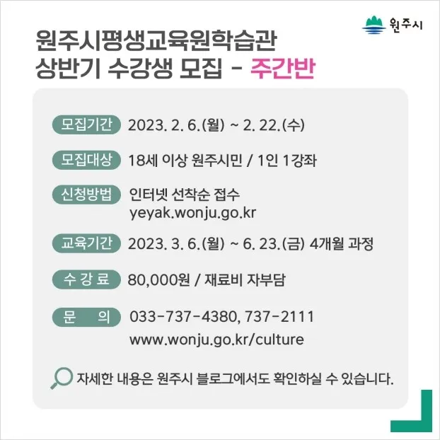 원주시 평생교육원 학습관 정규강좌 수강생 모집