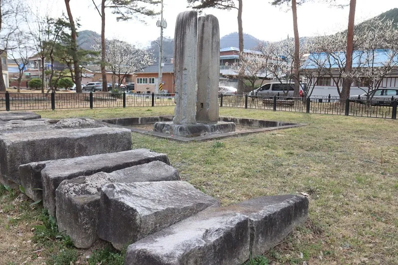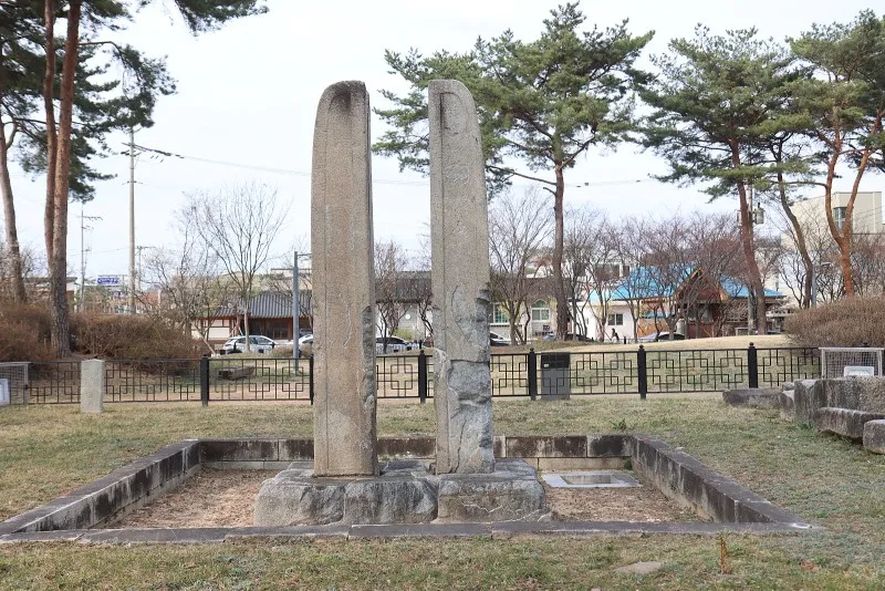 반죽동 공원은 대통사지 추정지로 당간지주는 사찰의 깃발인 당을 달거나 야외 법회시에 괘를 걸때 당간을 이용하는데 그 당간을 지탱했던 돌기둥을 뜻합니다. 돌에 붙어있는 이끼와 깍여나간 흠집은 그만큼 오랜 역사가 지났음을 증명합니다.