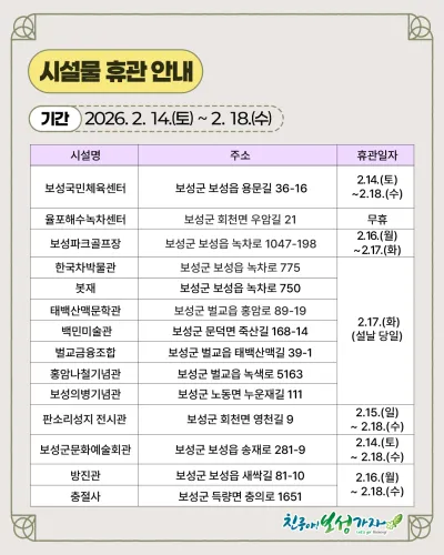 #보성군 #보성군청 #설연휴 #설명절 #연휴안내 #휴관안내 #시설휴관 #문화시설 #체육시설 #이용안내 #안전수칙 #명절안전 #교통안전 #화재예방 #가스안전 #생활안전 #겨울안전 #군청소식 #지역정보 #공공안내