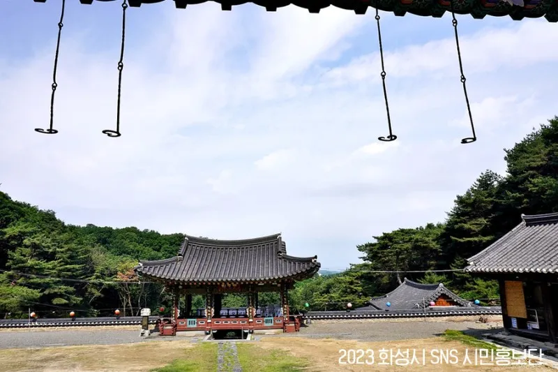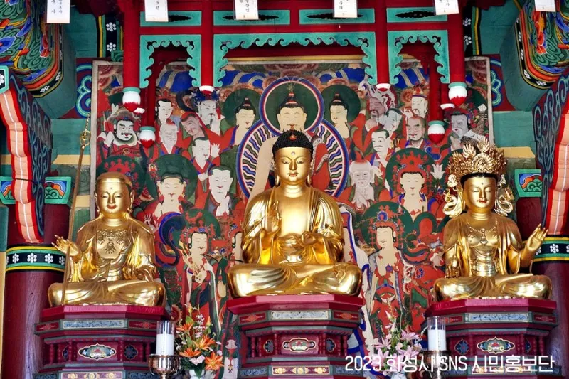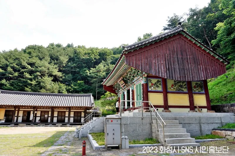 사찰 앞마당에서는 범종각 누각의 멋스러운 모습이 아름답고 주불전인 극락전이 마주합니다. 서방정토 극락세계에 머물면서 법을 설한다는 아미타불이 모셔졌습니다. 호국사찰의 특성상 전쟁으로 인해 희생된 영혼들을 극락세계로 안내하는 의미를 담은 듯합니다.
