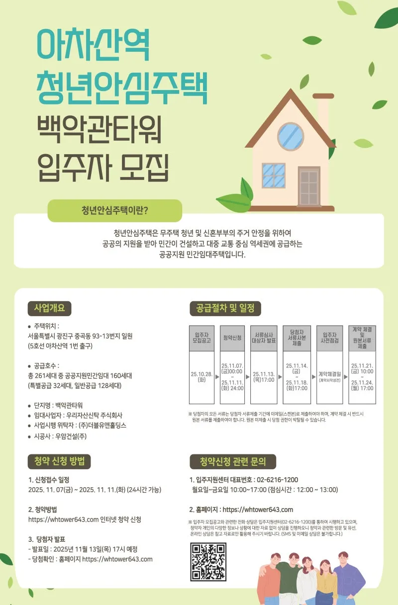 🔹건물명: 백악관 타워 🔹위치: 광진구 천호대로 643 (5호선 아차산역 1번 출구) 🔹공급호수: 총 261세대 중 공공지원민간임대 160세대 (특별공급 32세대, 일반공급 128세대) 🔹사업주체: 우리자산신탁 주식회사 🔹시공사: 우암건설(주) |